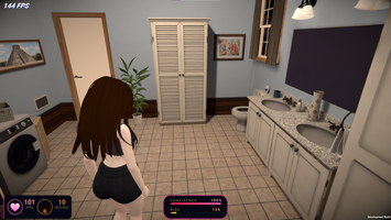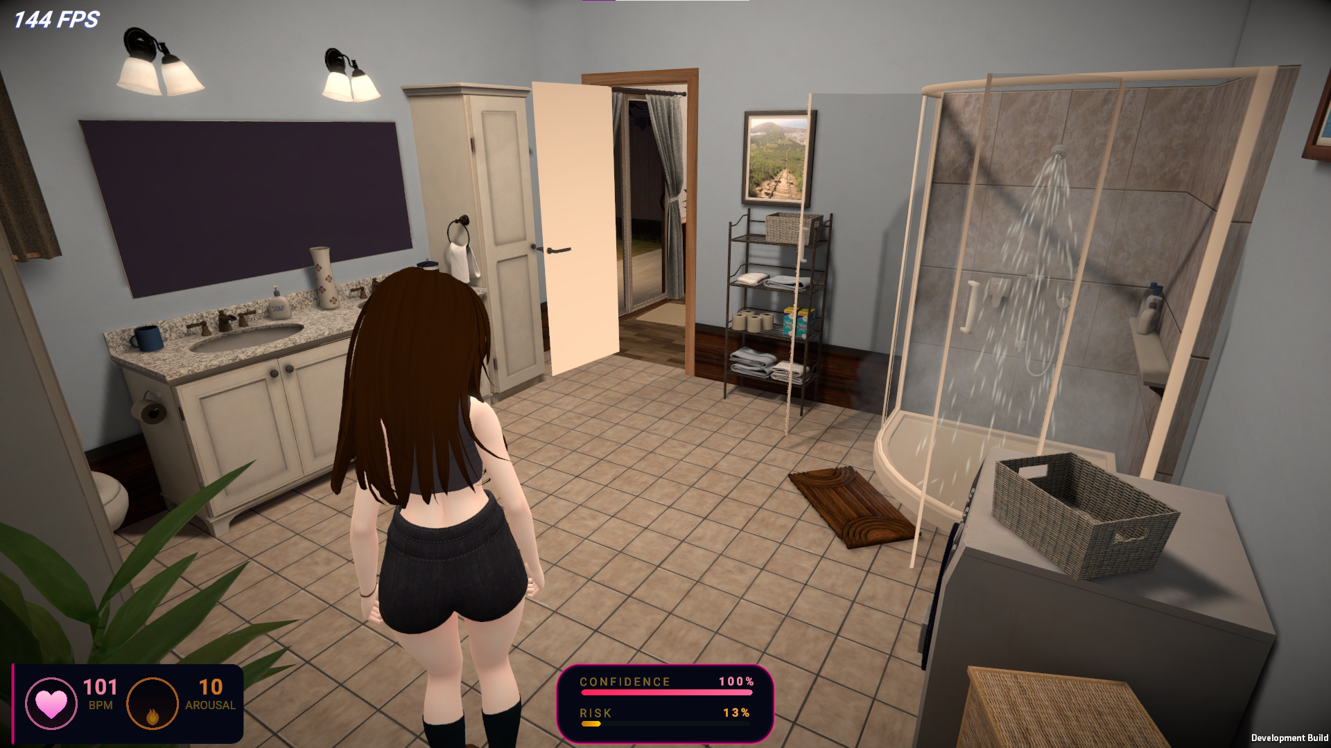 Sabia has a connected bathroom now! It's pretty open concept with all the things you'd want in a bathroom. Soon, I'd like to make a showering mechanic, where Sabia can wash off after an exciting night, or just to relax. You can also sit on the toilet like any other chair as well.